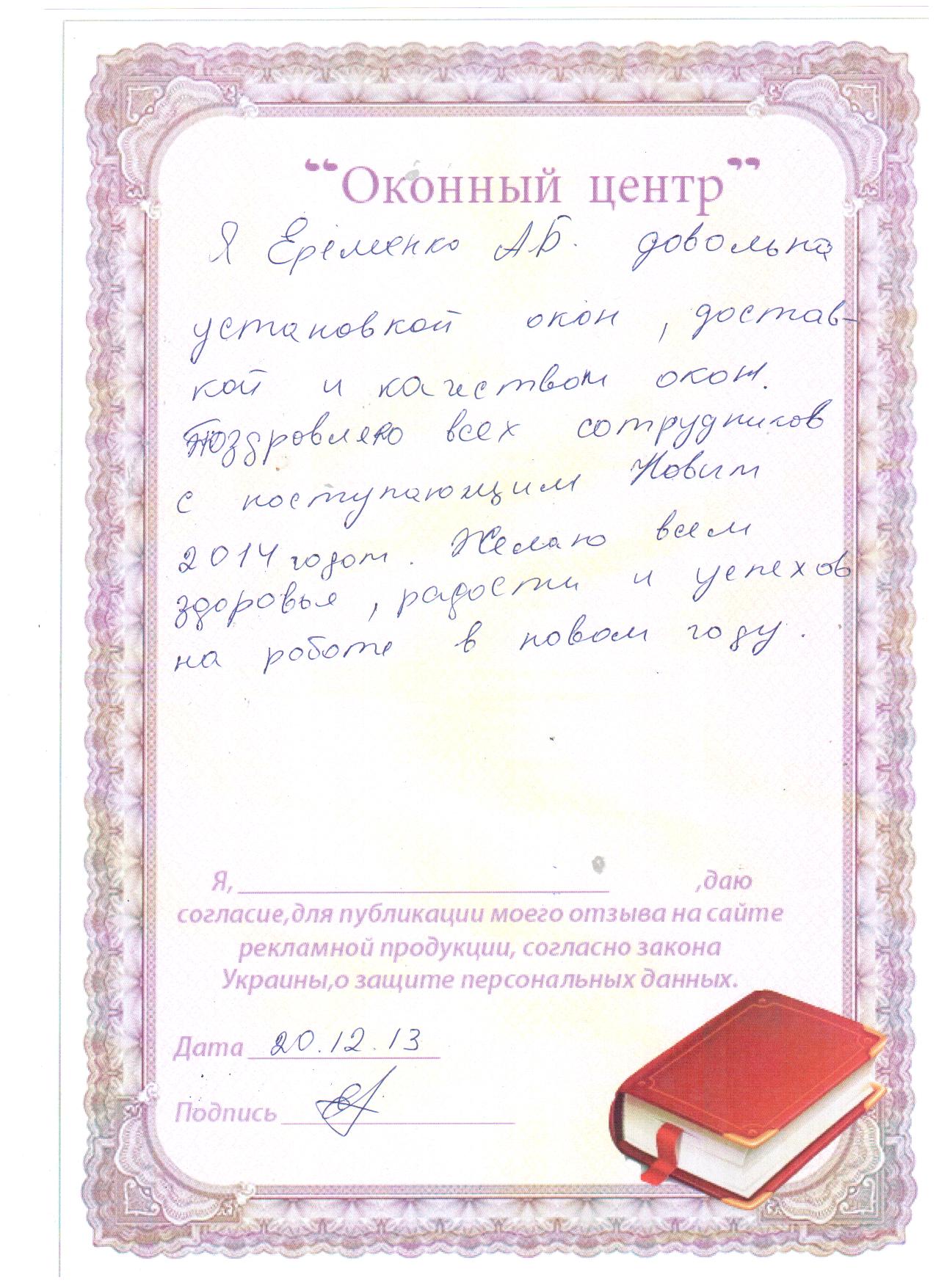 Я Еременко А.Б. довольна установкой окон, доставкой и качеством окон. Поздравляю всех сотрудников с Наступающим Новым 2014 годом. Желаю всем здоровья, радости и успехов на работе в Новом году.